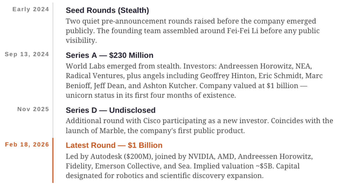 World Labs' fundraising trajectory is one of the fastest in recent AI startup history. Here is the complete timeline from inception to today: